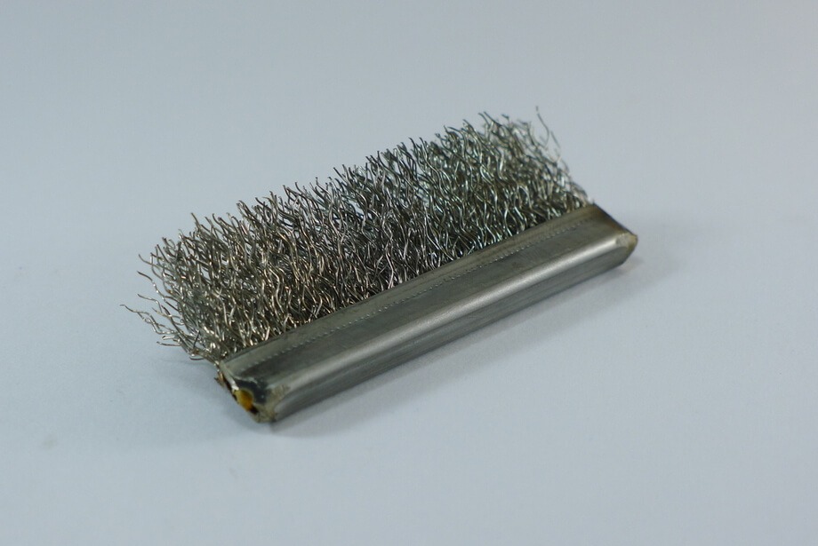 毛料材質為白鐵(SUS304)的鐵片刷,常用於高溫、高溼度或者浸水的工作環境中。白鐵的材質相較於絕大部分的塑膠更能夠抵檔高溫,而鐵片材質如果也使用白鐵,整支刷子就不容易生鏽而報銷。此外,金屬絲的剛性強,能讓工作物表面達到強力的清潔效果,例如可用於金屬表面除鏽作業上,適用於不怕刮傷的工作環境;對於表面細緻的工作環境則有刮傷之虞。