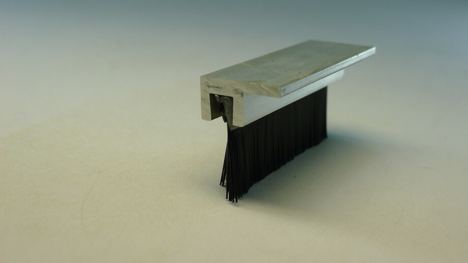 F型的鐵片刷的毛刷角度與鋁座的方向呈90度,能為客戶適應不同空間的解決方案,讓機構能夠更容易設計符合需求的鐵片刷零件。除了一般常用的尼龍毛刷材質以外,協榮毛刷廠也提供了抗靜電毛刷的材質,讓機器在行程中不會因為毛刷的磨擦而產生靜電,損害工作物。
