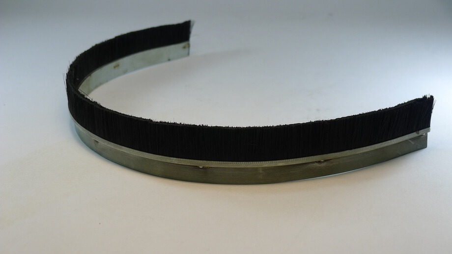 半圓形的防靜電刷,採用鐵片刷的方式,方便使用者固定覆蓋在機台上,避免灰塵落入造成髒污而影響工作行程;使用防靜電的毛料,則能避免行程中因為反覆磨擦累積產生靜電而造成靜電危害;當然,若沒有靜電的考量,也可以使用一般的尼龍毛即可。