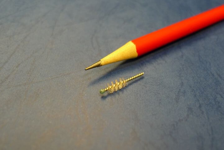 毛刷外徑2.3mm的尼龍管刷,用於清潔液晶顯示器(LCD)的背光模組(BLU)上裝載的冷陰極管(CCFL),在其製程形成的粉塵;鐵絲採用白鐵,賦予毛刷本體足夠的剛性,不易抝折;刷子末端也可像另一款冷極陰管清潔刷的末端進行點膠,避免刷洗作業時刮傷管身。