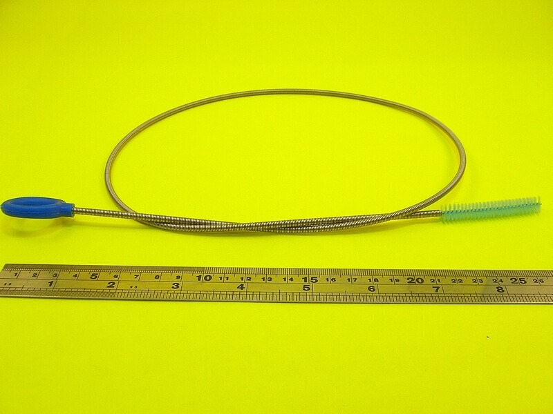 在恢復性好的彈簧前端接上股扭刷,讓刷子可以清潔細長的吸管;毛刷製造尺寸可依客戶需求訂製。毛刷採用單線製作的方式,避免鐵絲截斷面刮傷吸管